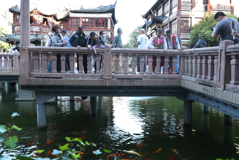 ↑马马尼大叔和妻子格洛丽亚在上海豫园游玩时观看水中的锦鲤(11月2日摄)。