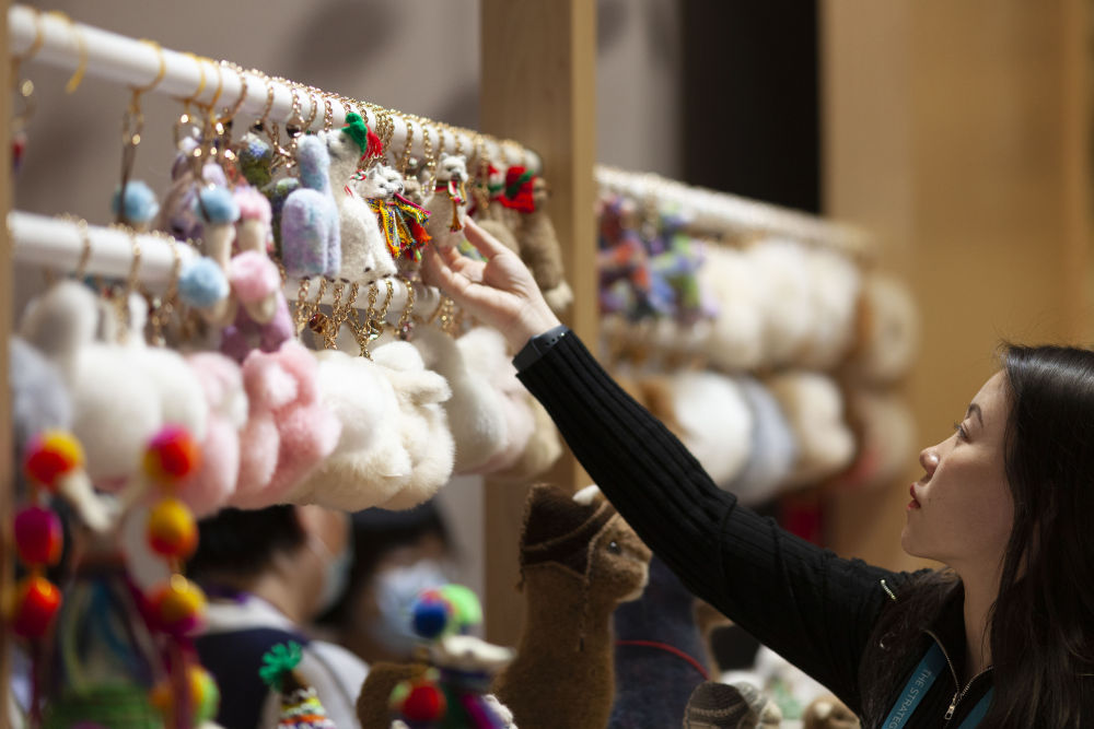 ↑11月7日,参观者在上海进博会“温暖驼”品牌展台挑选羊驼玩偶。