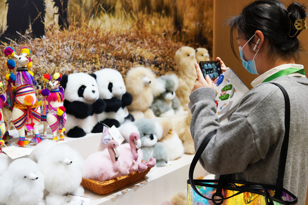 ↑11月7日,参观者在上海进博会“温暖驼”品牌展台观看马马尼大叔制作羊驼玩偶。