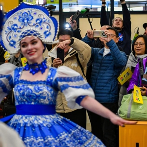 为了迎接这批游客,俄方可谓煞费苦心,不仅安排了穿着传统民族服饰的接机人员献上“盐和面包”的最高待客礼仪,还准备了形式多样的歌舞节目。演员们从“喀秋莎”唱到“莫斯科郊外的晚上”,从踢踏舞跳到卡德里尔舞,游客们随着音乐的节奏加入到舞蹈的行列,不少路过的外国旅客也跟着跳了起来,整个谢列梅捷沃机场的接机厅变成了一个大型派对现场。俄媒来了不少记者,里面有我熟识的一位塔斯社摄影壮汉,他憨笑着跟我说,“从来没见过这座机场如此热闹”。