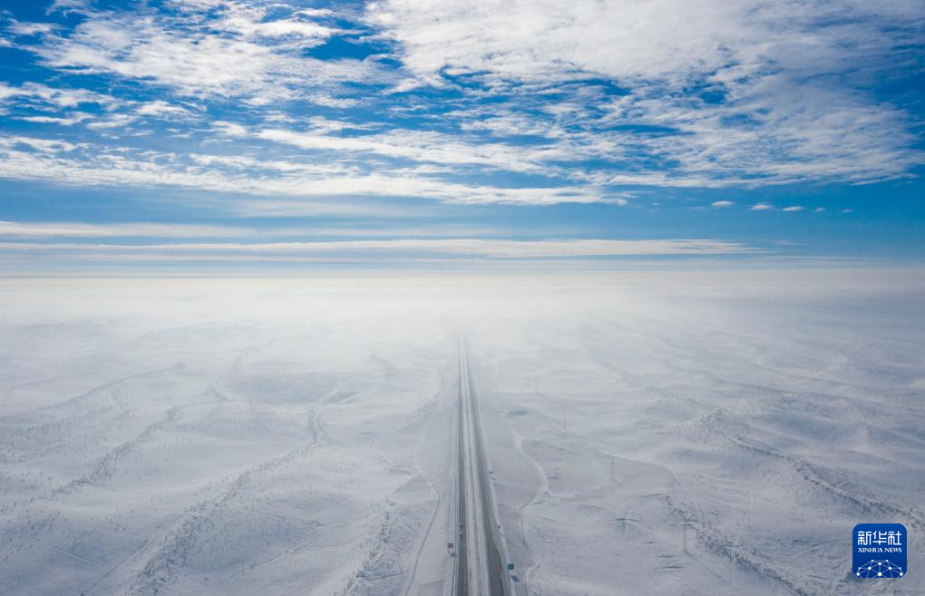 2023年1月16日在新疆境内的古尔班通古特沙漠拍摄的阿勒泰至乌鲁木齐的高速公路(无人机照片)。