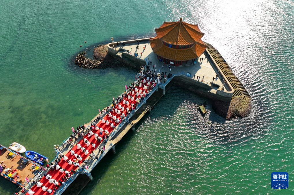 2023年11月12日,在山东省青岛市栈桥回澜阁前,新人参加集体婚礼(无人机照片)。