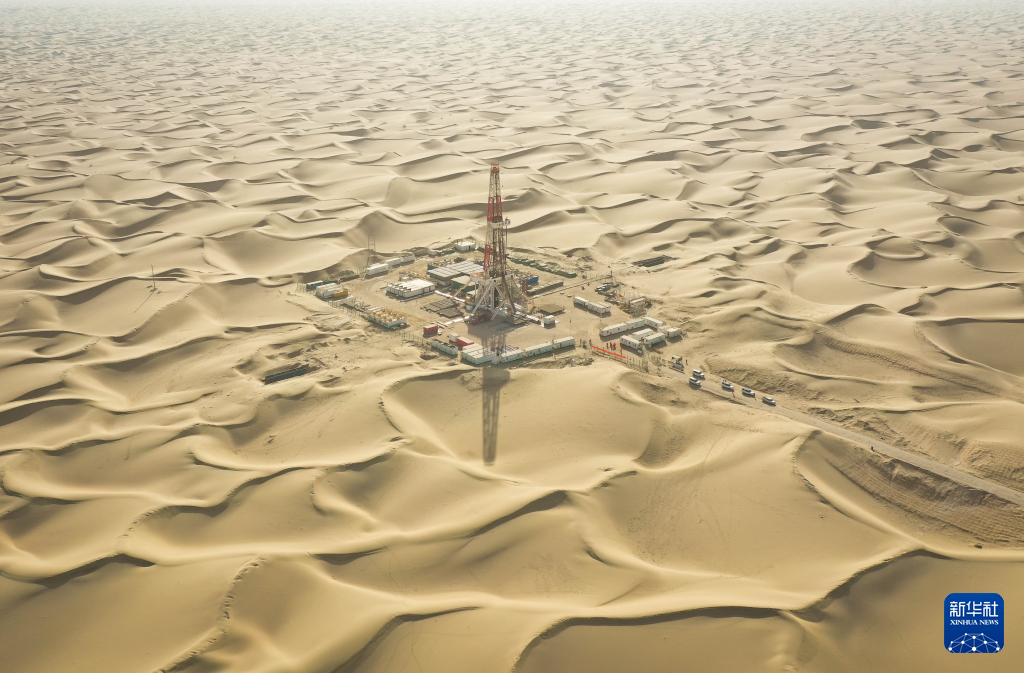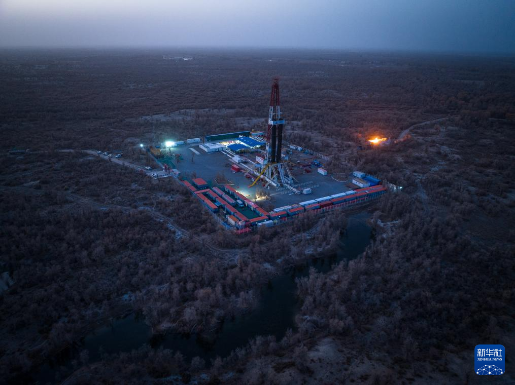 2023年11月15日拍摄的中国石化“深地一号”跃进3-3XC井(无人机照片)。中国石化11月15日宣布,公司部署在塔里木盆地的中国石化“深地一号”跃进3-3XC井测试获得高产油气流,日产原油200吨,天然气5万立方米。该井完钻井深达9432米,刷新亚洲最深井斜深和超深层钻井水平位移两项纪录。