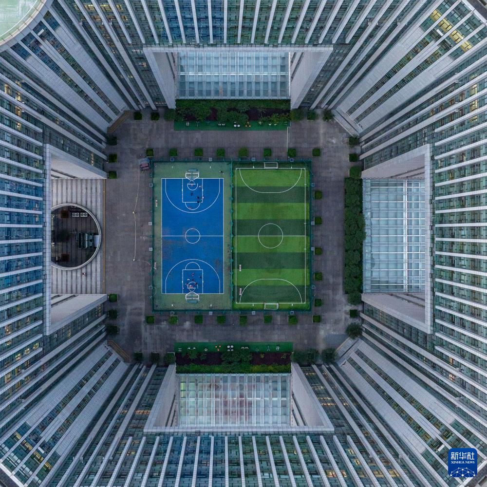 2023年6月13日,市民在南京市建邺区一处建筑内设置的微型体育场内运动(无人机照片)。