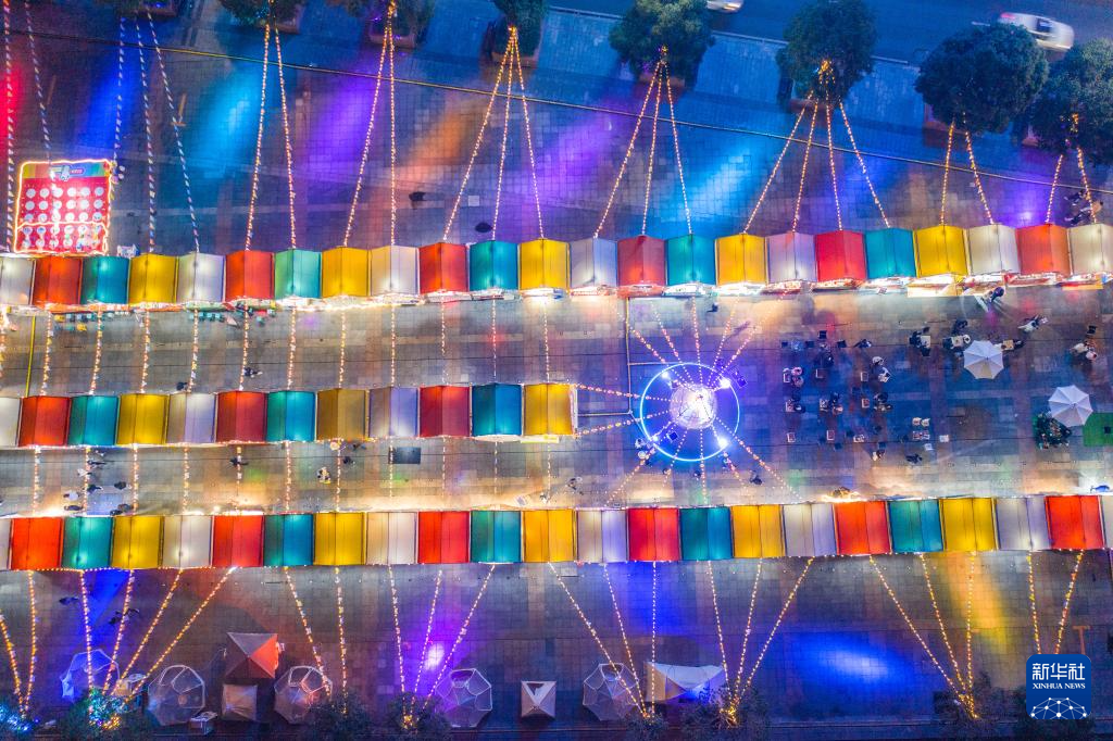 2023年2月9日晚在重庆市南岸区南滨路旁拍摄的彩虹集市(无人机照片)。2023年,重庆发布多条政策措施鼓励夜间消费,不断调整优化业态、改善消费环境,对多个特色夜市街区进行了提档升级,“夜经济”成为推动重庆建设国际消费中心城市的新动力。