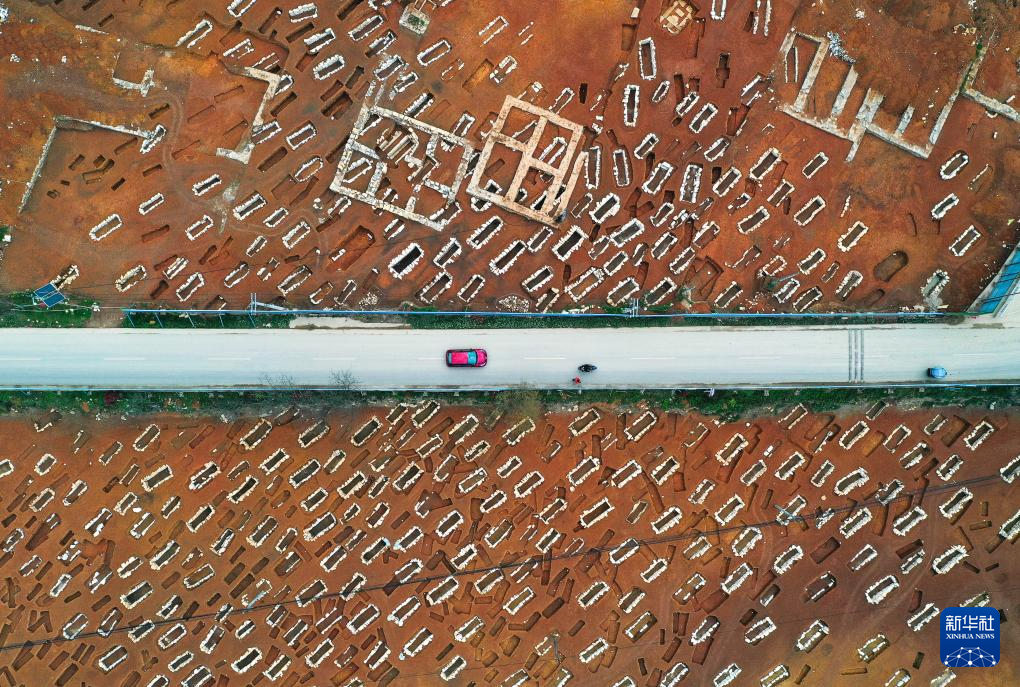2023年3月30日拍摄的贵州贵安新区大松山墓群挖掘现场(无人机照片)。贵州贵安新区大松山墓群入选2022年度全国十大考古新发现。