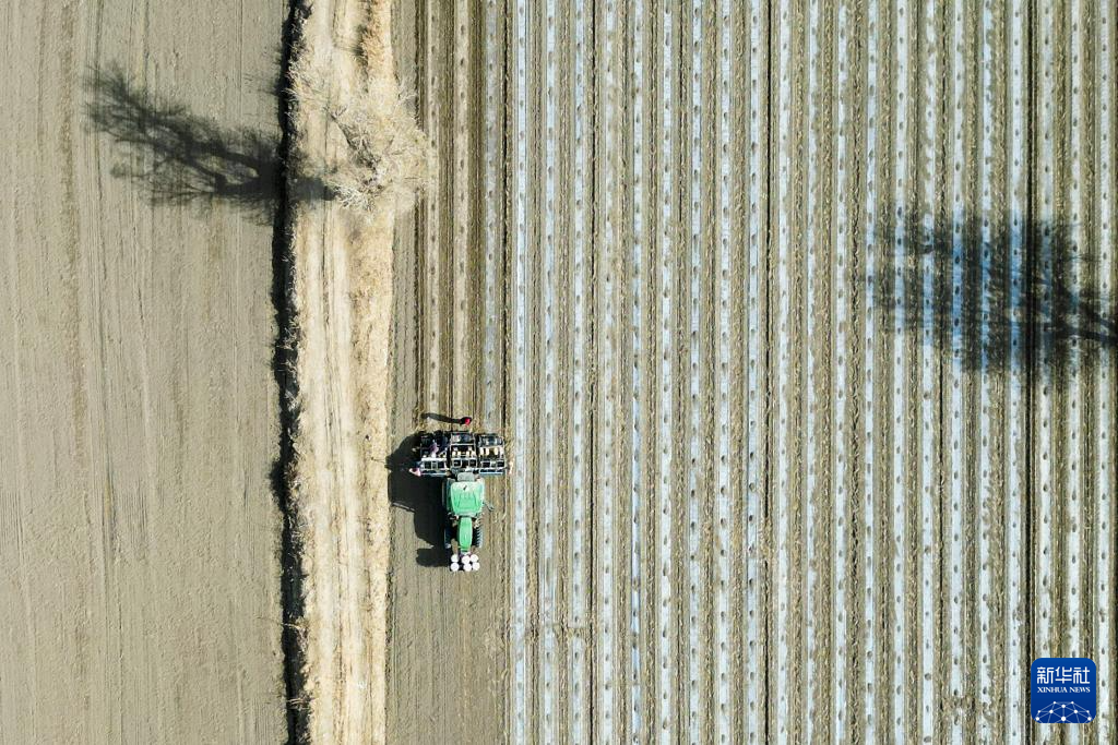 2023年3月29日,在新疆尉犁县,棉农进行春播作业(无人机照片)。