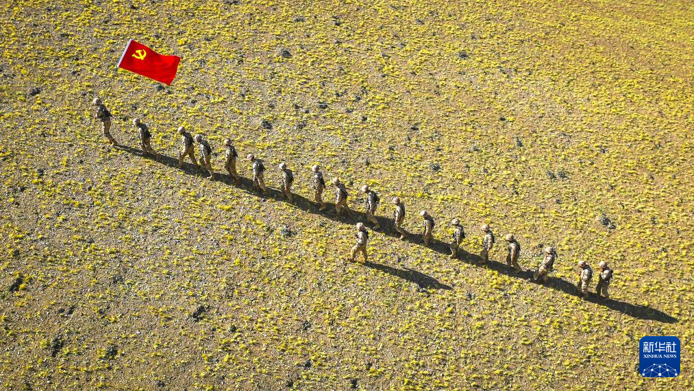 2023年6月30日,新疆军区某合成团官兵高擎党旗在海拔5400米的喀喇昆仑高原巡逻(无人机照片)。