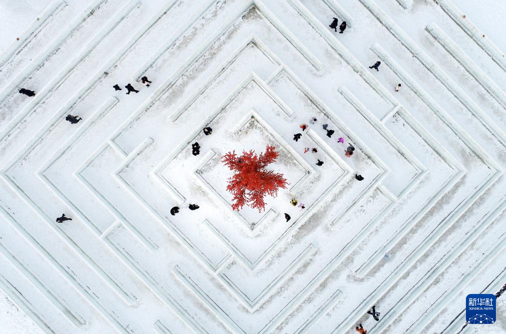 2023年2月12日,游客在内蒙古呼和浩特冰雪节冰雪景区感受冰雪迷宫乐趣(无人机照片)。