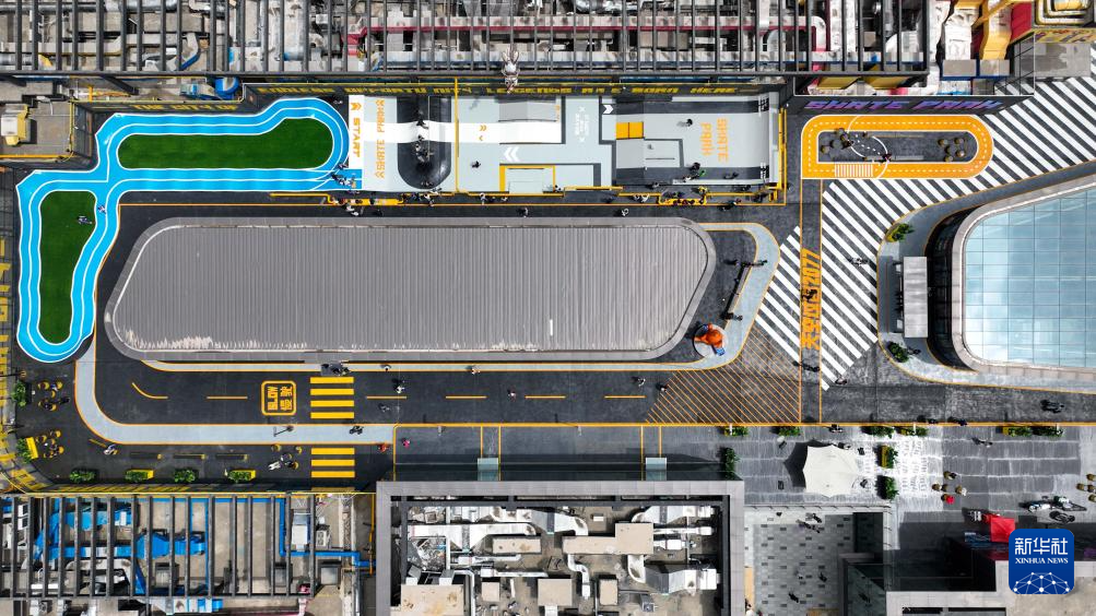 2023年4月28日拍摄的天津中海环宇城购物中心楼顶滑板公园(无人机照片)。