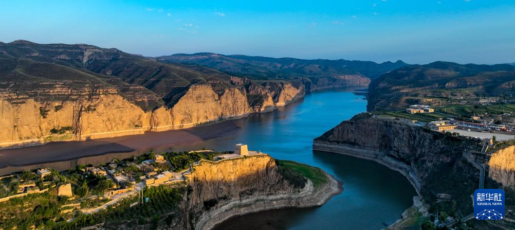 2023年8月29日在山西省偏关县拍摄的晨曦下的黄河老牛湾,长城和黄河在此“握手”(无人机照片)。