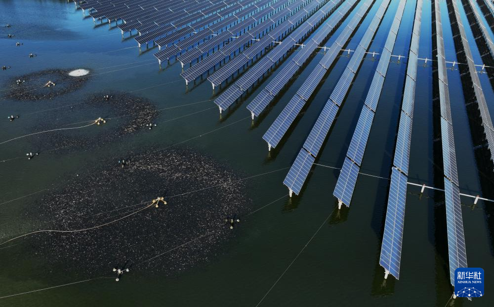 2023年9月16日,鱼群在河北省唐山市丰南区黑沿子镇“渔光一体”现代渔业产业园鱼塘内觅食(无人机照片)。
