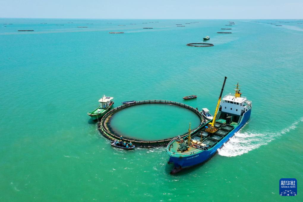 2023年5月27日,在广东省湛江市徐闻县西连镇,徐闻国桥深海养殖有限公司的金鲳鱼深海网箱整齐排列(无人机照片)。