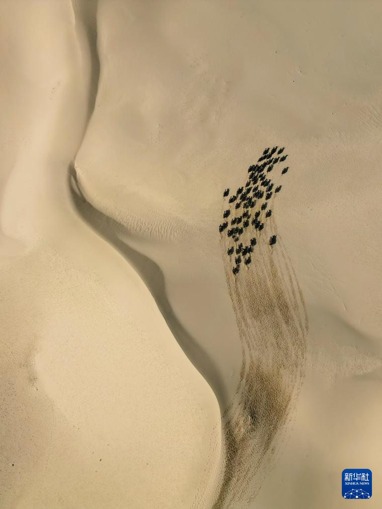 2023年9月14日在新疆境内的阿尔金山国家级自然保护区库木库里沙漠拍摄的一群野牦牛(无人机照片)。