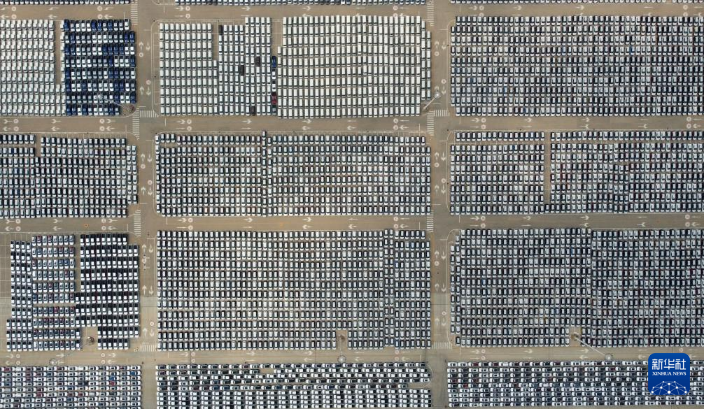 2023年7月7日,汽车整齐排列在天津港海嘉滚装码头(无人机照片)。