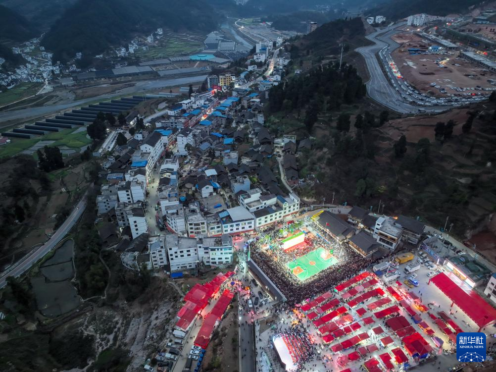 2023年3月26日,贵州省首届“美丽乡村”篮球联赛总决赛在黔东南州台江县台盘村落幕。这是比赛开始前的台盘村全景(无人机照片)。