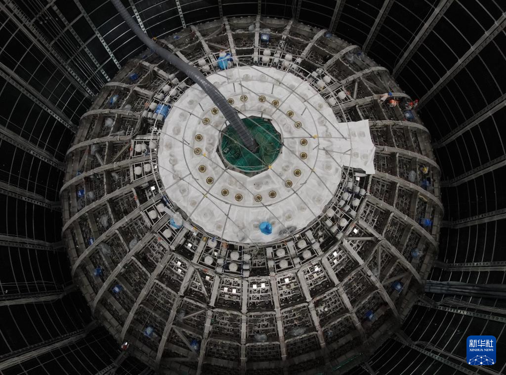 2023年6月14日,在广东省江门开平市,位于地下700米的江门中微子实验探测器呈现巨大的球形结构(无人机照片)。