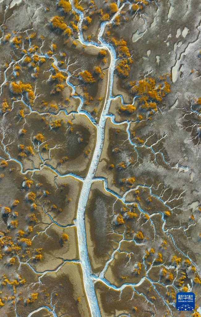 2023年2月1日拍摄的辽宁盘锦辽河口湿地“冰脉”(无人机照片)。海水在潮汐作用下涌入辽河口湿地的潮沟,并凝结成冰,从高空看去,宛若蜿蜒曲折、形态各异的“冰脉”。