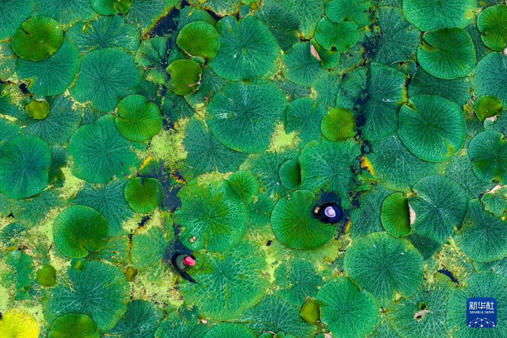 2023年8月21日,江苏省泰州市姜堰区顾高镇申俞村农民在采收芡实(无人机照片)。