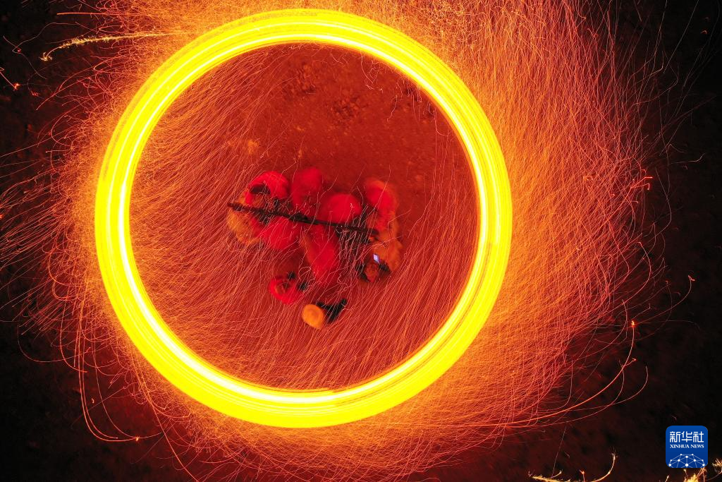 2023年7月5日,河北省滦平县火斗山镇大店子村的民间艺人在表演“抡花”(无人机照片)。