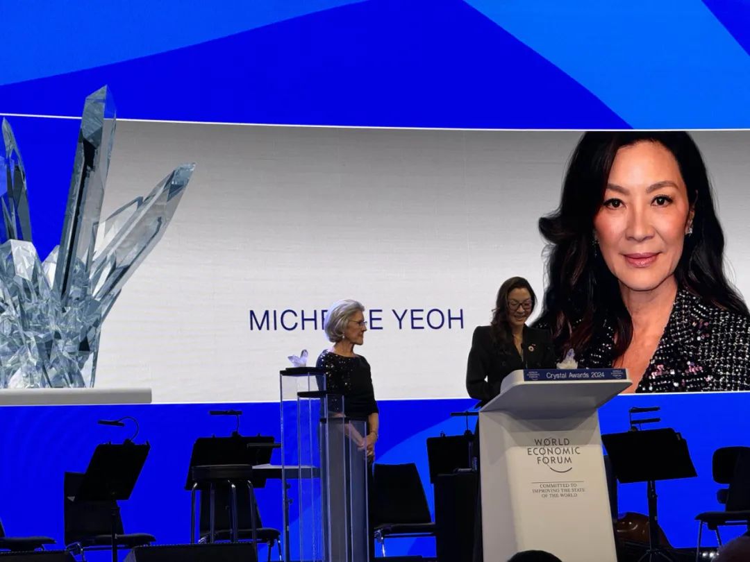 14日晚上六点,达沃斯会议中心,作为论坛开幕前最重要的活动,“水晶奖”颁奖典礼和开幕音乐会盛大上演。论坛总裁布伦特与欧盟委员会主席冯德莱恩谈笑风生地入场,在第一排转身向宾客打招呼,获奖者之一的亚裔女影星杨紫琼,带着标志性笑容,接受着参会者同时也是影迷的致意。
