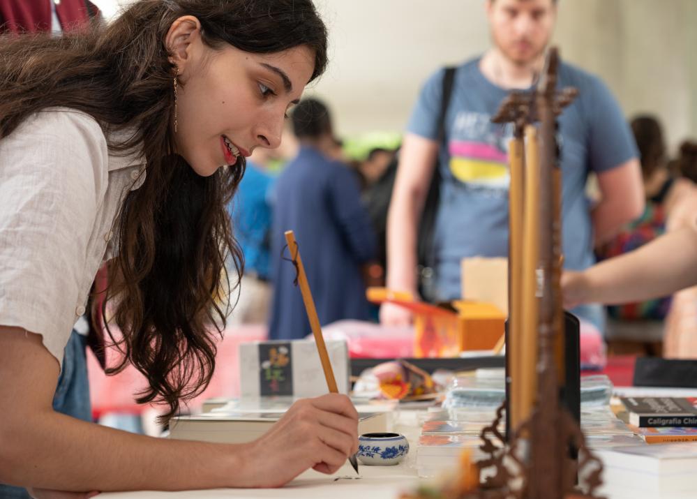 ↑2023年4月19日,参观者在巴西里约热内卢体验中国书法。