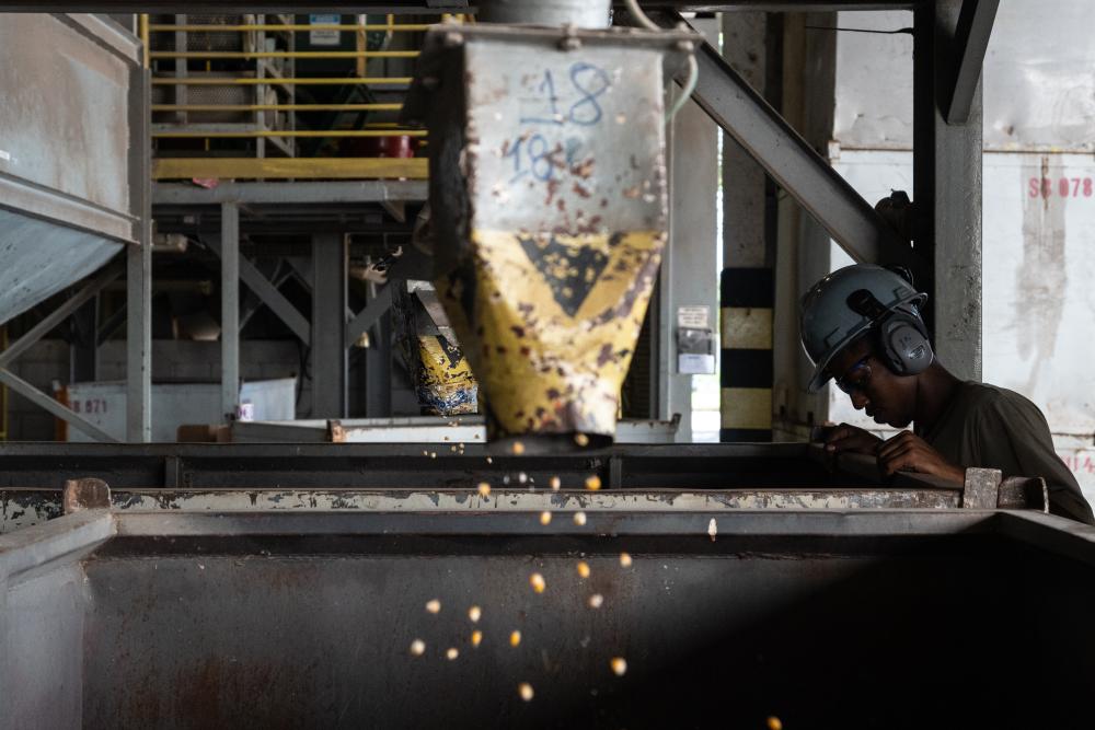 ↑2023年3月25日,在位于巴西圣保罗州雅尔迪诺波利斯的隆平巴西种子工厂,工作人员检查玉米种子分拣情况。