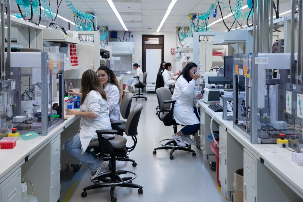 ↑2023年10月11日,科研人员在位于巴西圣保罗州克拉维纽斯的隆平巴西分子生物实验室内工作。