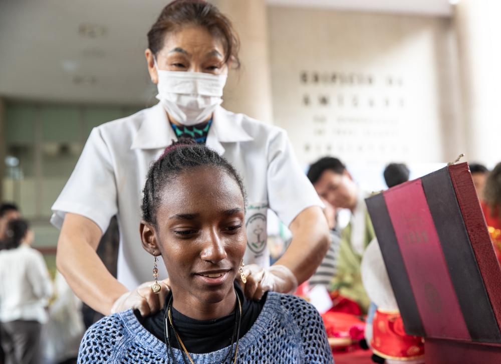 ↑2023年4月19日,一名学生在巴西里约热内卢体验中医治疗。