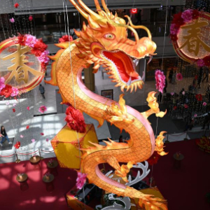 在“牛车水”,以祥龙祥云为主题的新春灯饰将街区装点得璀璨一新,矗立在十字路口的八米高的巨龙灯饰更是引人驻足拍照。街巷上悬挂的“万事如意”“五福临门”“和气生财”“祥龙献瑞”等标语传递着人们对吉祥、富足和幸福的向往。