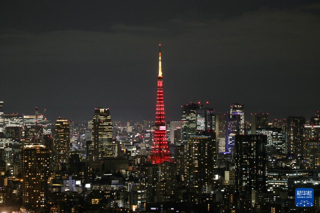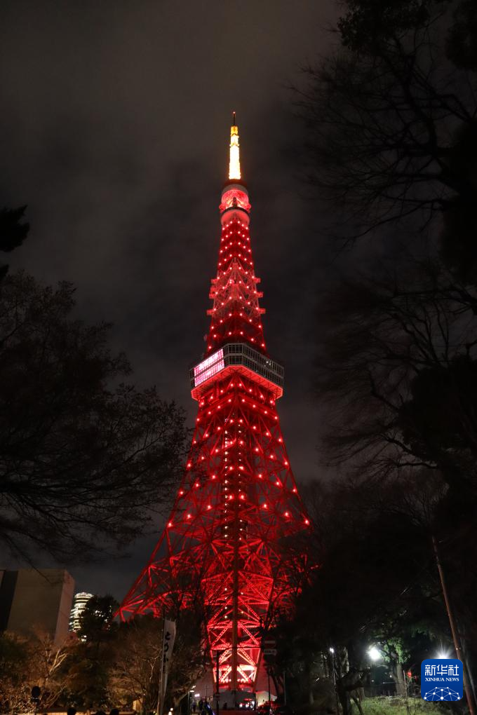 2月9日晚,日本东京的地标性建筑东京塔点亮“中国红”,庆祝中国农历新年。