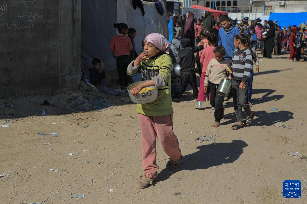 2月9日,在加沙地带南部城市拉法,巴勒斯坦儿童领取完救济食物后返回。