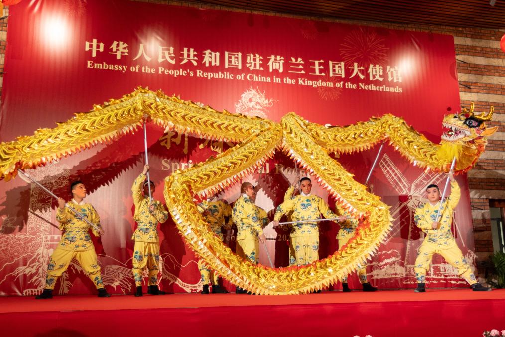 2月8日,浙江婺剧艺术研究院演员在荷兰海牙中国驻荷兰大使馆举办的新春招待会上表演《九节龙》。(新华社发,西尔维娅·莱德雷尔摄)