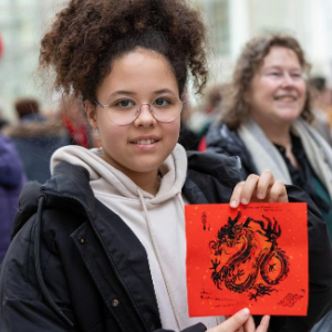 2月24日,一名观众在荷兰海牙市政厅展示龙年年画。当日,“福龙迎新春”暨元宵节庙会活动在荷兰海牙市政厅举行。