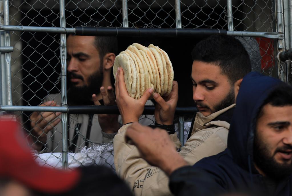 2月27日,在加沙地带北部的杰巴利耶难民营,人们领取食物。新华社发(穆罕默德·阿里摄)