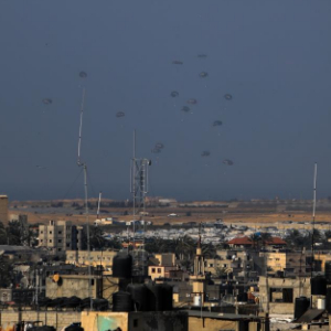这是2月27日拍摄的向加沙地带空投的救援物资。约旦武装部队27日发表声明说,约旦皇家空军当天向巴勒斯坦加沙地带空投了一批救援物资。新华社发(亚西尔·库迪摄)