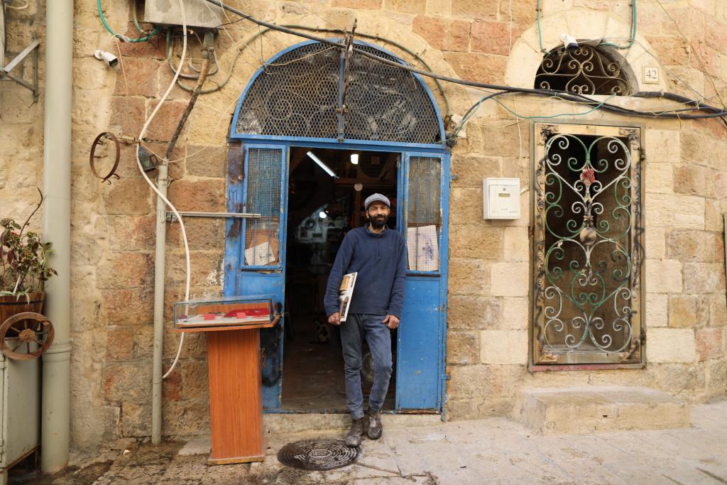 2月26日,拉米·纳布尔西在耶路撒冷老城的自家银器店外留影。新华社发(贾马尔·阿瓦德摄)