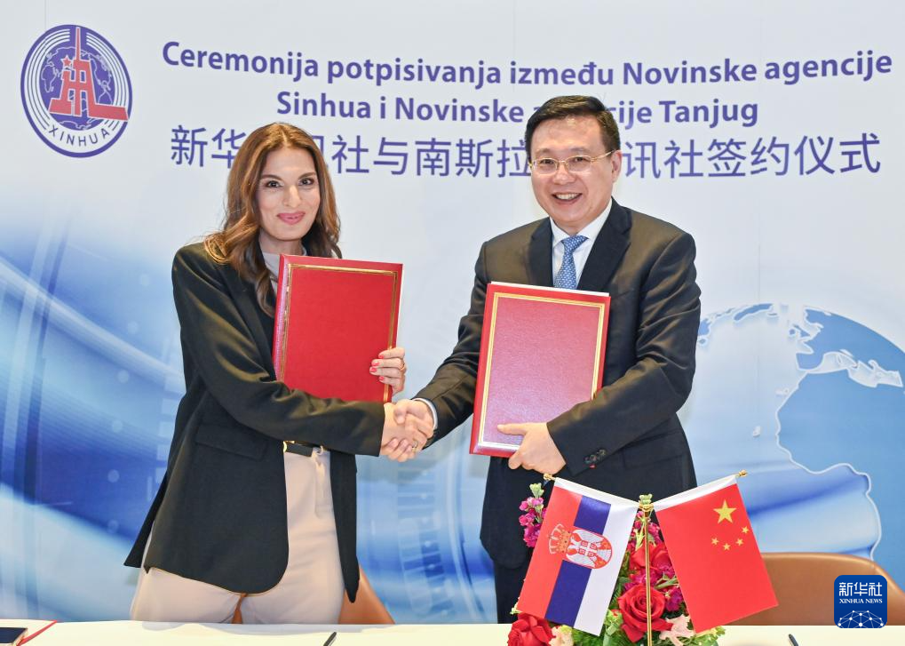 4月30日,新华通讯社社长、新华社国家高端智库学术委员会主任傅华出席在贝尔格莱德举行的中塞媒体智库研讨会暨《构建人类命运共同体的时代价值和实践成就》(塞文版)智库报告发布仪式并发表主旨讲话。会后,新华社同南通社签署新闻交换协议,双方一致同意加强在新闻传播领域的交流与合作。这是傅华同塞尔维亚南斯拉夫通讯社社长格尔契奇在签约仪式上握手。