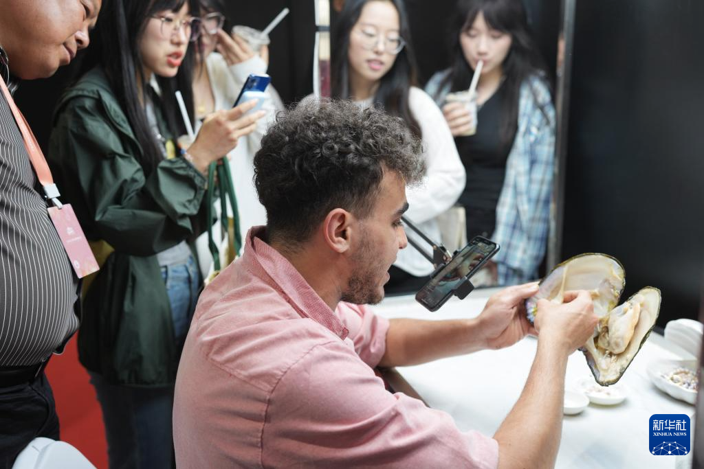 5月20日,在浙江省诸暨市,一名阿尔及利亚籍主播在直播开蚌。新华社记者 翁忻旸 摄
