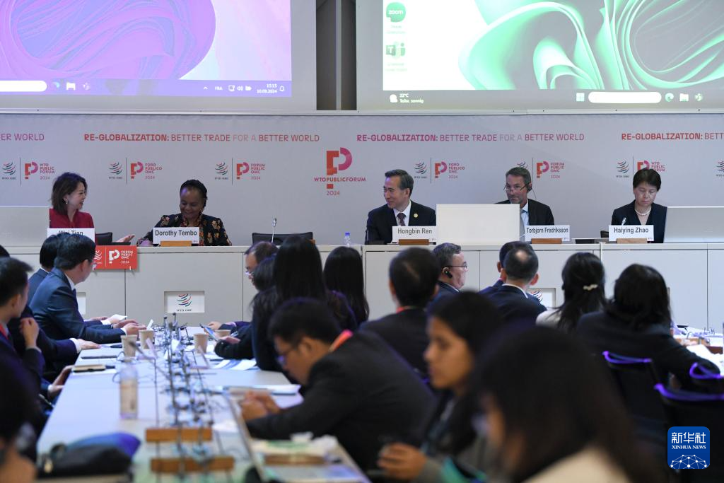 9月10日,在瑞士日内瓦世界贸易组织总部,中国贸促会会长任鸿斌(中)和与会者在研讨会上交流。新华社记者 连漪 摄