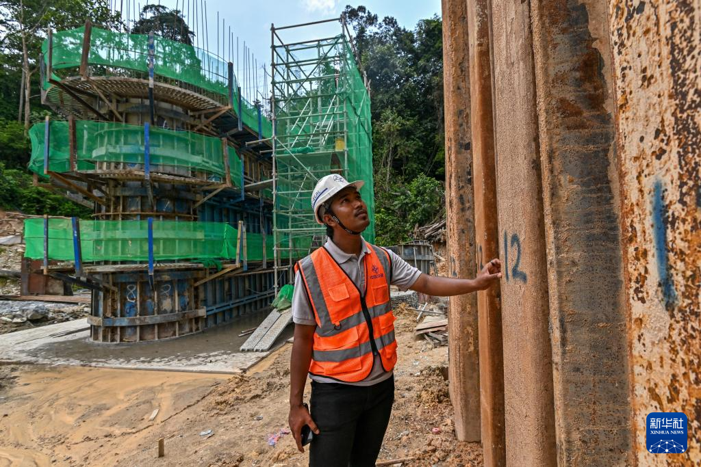10月11日,在马来西亚雪兰莪州,中交马东铁项目现场工程师阿兹里尔·哈基姆在施工现场视察工程。