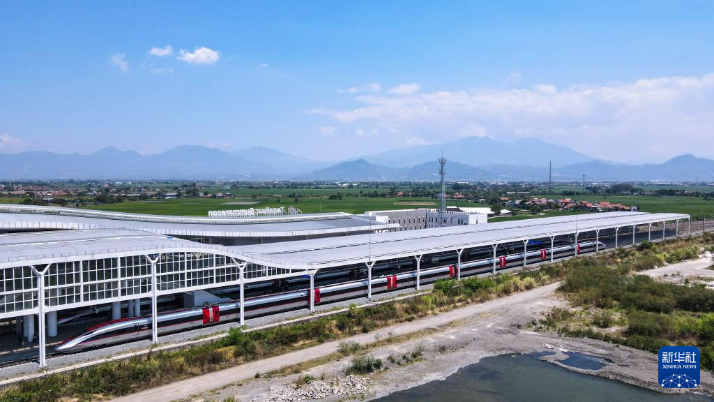 9月13日,在印度尼西亚万隆德卡鲁尔站,雅万高铁高速动车组列车停靠在站台上(无人机照片)。