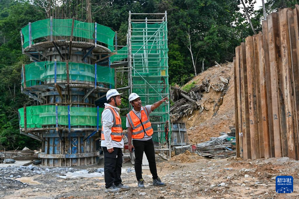 10月11日,在马来西亚雪兰莪州,中交马东铁项目现场工程师阿兹里尔·哈基姆(右)与马东铁鹅唛车站施工负责人陈威柏(左)在施工现场视察工程。