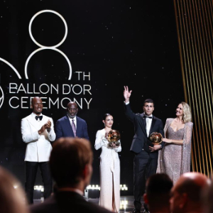 当日,一年一度的金球奖颁奖典礼在巴黎夏特莱剧院举行,西班牙足球成为当晚的最大赢家——罗德里与邦马蒂分别荣获男、女足金球奖,17岁的天才少年亚马尔则摘得象征最佳年轻球员的“科帕奖”。