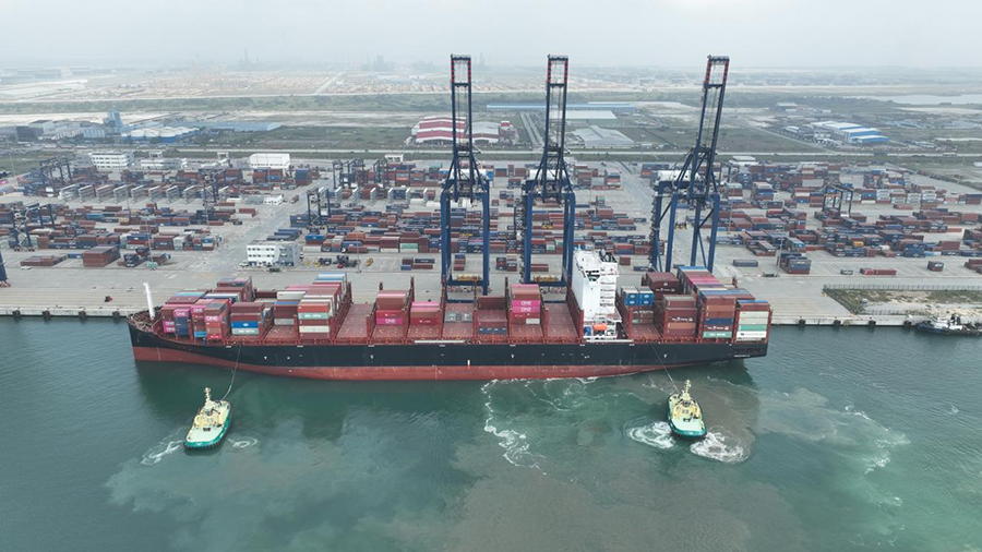 近日,中远中国至西非航线集装箱货轮靠泊尼日利亚拉各斯莱基港。(图片由中国港湾尼日利亚莱基港有限公司提供)