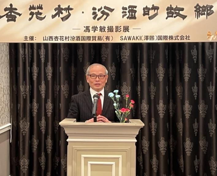 12月19日,在日本东京,旅日摄影家冯学敏在“杏花村·汾酒的故乡”摄影展上致辞。(岳晨星 摄)