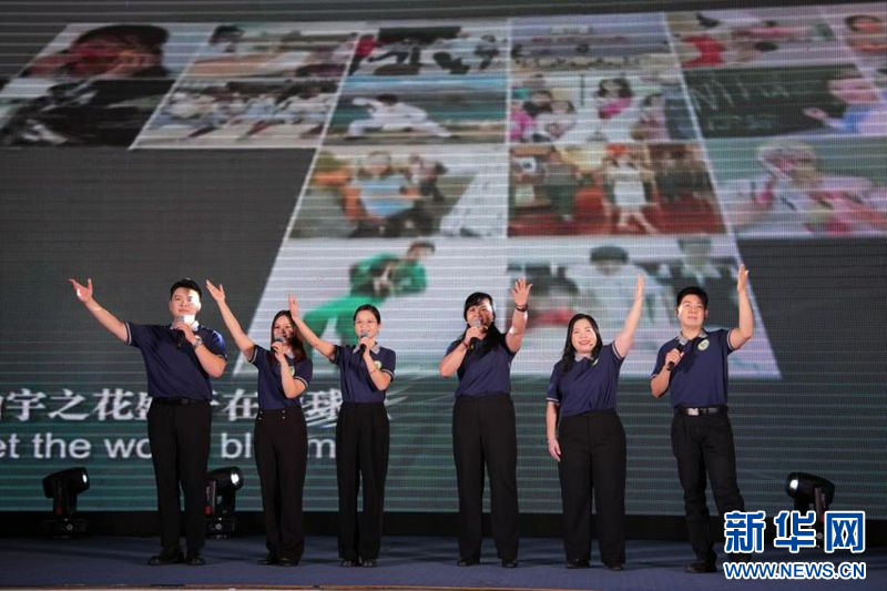 12月26日晚,越南河内大学孔子学院副院长韦爱云同五位中国教师在河内大学合唱《瀚宇之花盛开》。新华社记者胡佳丽 摄