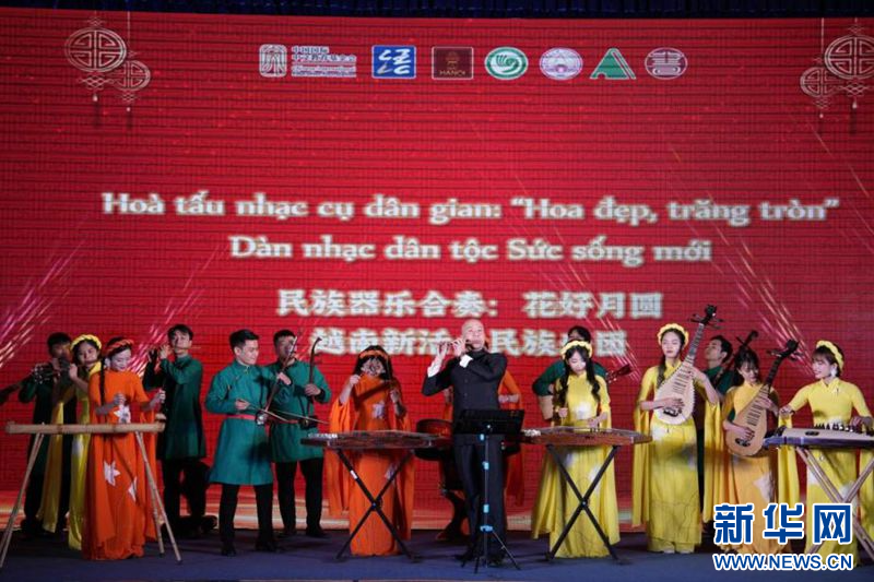 12月26日晚,越南新活力民族乐团在河内大学演奏《花好月圆》。新华社记者胡佳丽 摄