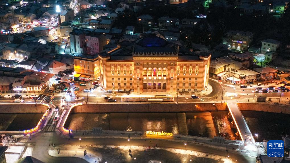 这是1月5日在波黑首都萨拉热窝拍摄的市政厅(无人机照片)。