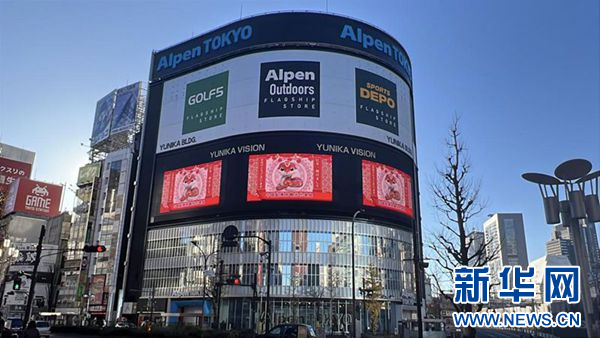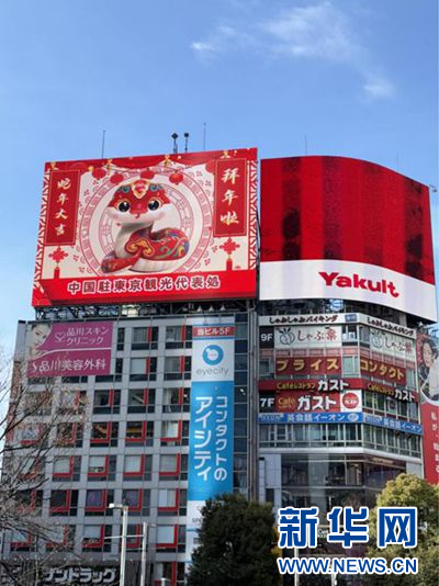 1月1日,“吉祥蛇”蛇年拜年视频在东京新宿附近一处建筑的大屏上播放。(图片由中国驻东京旅游办事处提供)